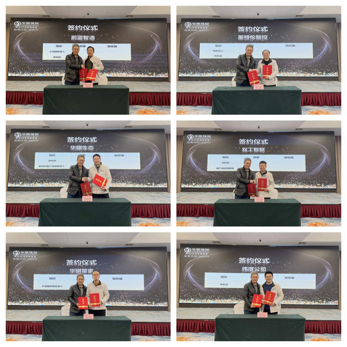 華騏環(huán)保旗下安徽英特倫智控股份有限公司、安徽華騏蔚藍(lán)智能裝備有限公司、安徽華騏管家環(huán)保咨詢服務(wù)有限公司、安徽華騏生態(tài)環(huán)境材料有限公司以及2024年新成立的安徽雙工智聯(lián)環(huán)??萍脊煞萦邢薰?、馬鞍山市緯度建筑工程有限公司六家主要專業(yè)子公司齊聚一堂,匯報(bào)了2024年的經(jīng)營(yíng)成果、核心業(yè)務(wù)發(fā)展,制定了主要專業(yè)子公司三年發(fā)展規(guī)劃,并舉行了2025年承諾指標(biāo)簽約儀式。