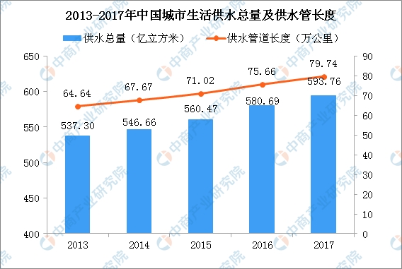 城鎮(zhèn)化水平提升,城市基礎(chǔ)設(shè)施建設(shè)必然要適應(yīng)城市發(fā)展,將推動(dòng)與人們?nèi)粘I钕⑾⑾嚓P(guān)的城市公共供水設(shè)施及其重要環(huán)節(jié)二次供水設(shè)施的建設(shè)。2013年至2017年,我國(guó)城鎮(zhèn)化率由53.73%提升至58.52%,相應(yīng)地每年生活供水總量由537.30億立方米增長(zhǎng)至593.76億立方米,供水管道長(zhǎng)度由64.64萬公里增加至79.74萬公里。如果不考慮城鎮(zhèn)供水普及率提升的影響,平均城鎮(zhèn)化率每提升1個(gè)百分點(diǎn),供水管道長(zhǎng)度需要增加2.71萬公里。