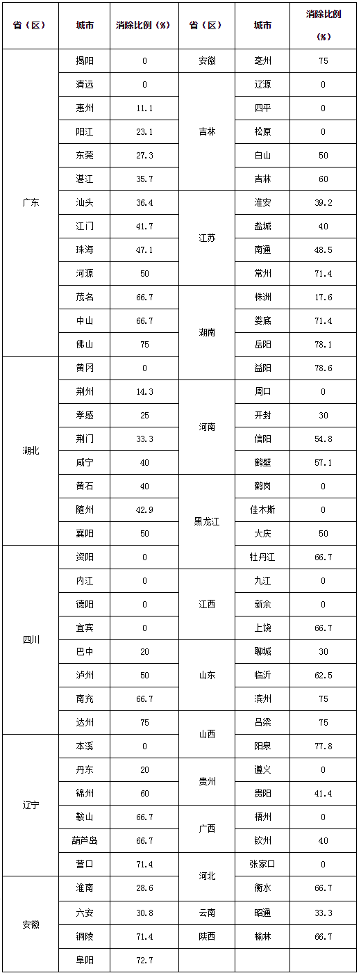 根據(jù)排查結(jié)果,全國(guó)共有77個(gè)城市黑臭水體消除比例低于80%,涉及廣東(13個(gè)城市,下同)、湖北(8個(gè))、四川(8個(gè))、遼寧(6個(gè))、安徽(5個(gè))、吉林(5個(gè))、江蘇(4個(gè))、湖南(4個(gè))、河南(4個(gè))、黑龍江(4個(gè))、江西(3個(gè))、山東(3個(gè))、山西(2個(gè))、貴州(2個(gè))、廣西(2個(gè))、河北(2個(gè))、云南(1個(gè))、陜西(1個(gè))。其中,四川省內(nèi)江、德陽(yáng)、資陽(yáng)、宜賓,吉林省遼源、四平、松原,廣東省揭陽(yáng)、清遠(yuǎn),江西省九江、新余,黑龍江省鶴崗、佳木斯,湖北省黃岡,貴州省遵義,遼寧省本溪,廣西壯族自治區(qū)梧州,河北省張家口,河南省周口等19個(gè)城市消除比例為0。具體城市名單及消除比例見(jiàn)附表。