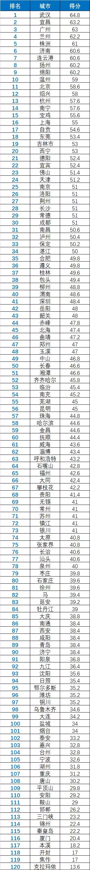 2019年,環(huán)保公益組織公眾環(huán)境研究中心通過(guò)搜集政府公開(kāi)信息,對(duì)全國(guó)120個(gè)環(huán)保重點(diǎn)城市的水質(zhì)信息公開(kāi)進(jìn)行評(píng)價(jià),該表為水質(zhì)信息公開(kāi)指數(shù)排名,排名越靠前公開(kāi)質(zhì)量越高。