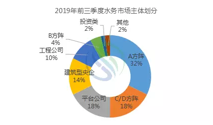 從水務(wù)市場(chǎng)主體份額的占比看,水務(wù)市場(chǎng)主體正在發(fā)生悄然變化,A方陣、C/D方陣、平臺(tái)公司、建筑型央企、工程公司所拿項(xiàng)目數(shù)量占比整個(gè)水務(wù)市場(chǎng)總數(shù)量的92%,并形成了五雄割據(jù)的局面。值得一提的是,今年以來(lái),平臺(tái)公司和建筑型央企在水務(wù)市場(chǎng)的表現(xiàn)搶眼,會(huì)對(duì)水務(wù)市場(chǎng)原有的格局造成一定的沖擊。