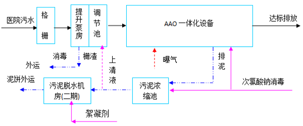 馬鞍山市秀山新區(qū)綜合醫(yī)院將建成集醫(yī)療、科研、教學(xué)、預(yù)防、保健、急救為一體的三級現(xiàn)代化綜合醫(yī)院。醫(yī)院污水主要為醫(yī)療及病房區(qū)污水,設(shè)計建設(shè)總規(guī)模為Q=1200 m3/d,分為兩期,一期配套設(shè)備規(guī)模Q=600 m3/d,處理工藝采用:AAO+沉淀+消毒,污水處理站24小時運行,全自動控制。經(jīng)污水處理站經(jīng)處理,符合《醫(yī)療機(jī)構(gòu)水污染排放標(biāo)準(zhǔn)》(GB18466-2005)中預(yù)處理標(biāo)準(zhǔn)后排入市政污水收集管網(wǎng),經(jīng)東部污水處理廠處理達(dá)標(biāo)后外排。