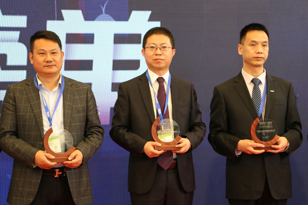 副總裁連宏偉(中)代表公司領(lǐng)取“環(huán)博會(huì)百?gòu)?qiáng)企業(yè)”獎(jiǎng)杯