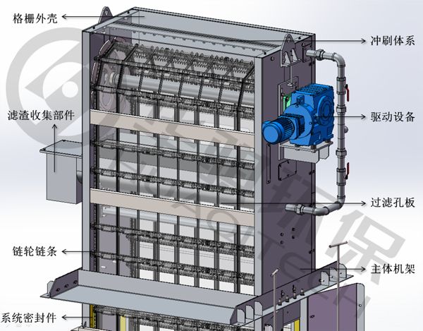 SupFTM產(chǎn)品結(jié)構(gòu):主要由驅(qū)動設(shè)備、主體機架、外殼、鏈輪鏈條、過濾孔板、沖刷體系、系統(tǒng)密封件、濾渣收集部件、及電氣控制柜等部件構(gòu)成。