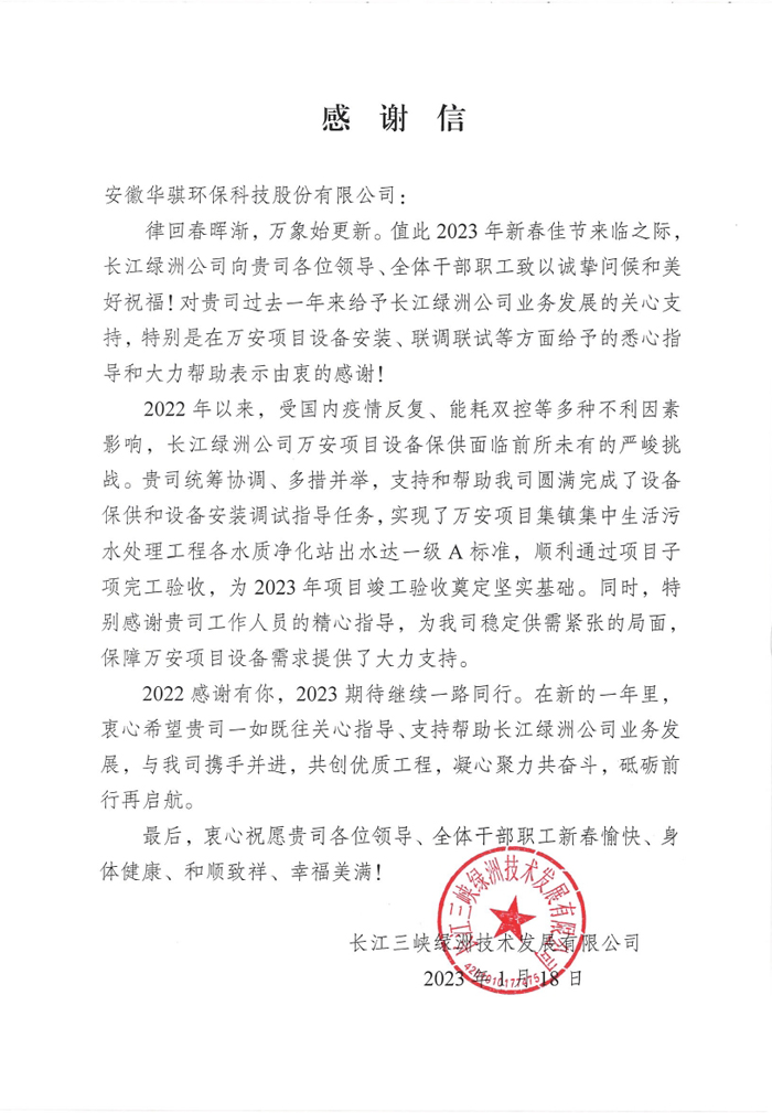 1月18日,長江三峽綠洲技術(shù)發(fā)展有限公司向安徽華騏環(huán)??萍脊煞萦邢薰景l(fā)來感謝信,對華騏環(huán)保積極參與江西省萬安縣城鄉(xiāng)水環(huán)境治理項目15個鄉(xiāng)鎮(zhèn)一體化污水處理設(shè)備安裝、聯(lián)調(diào)聯(lián)試等方面工作給予的悉心指導(dǎo)和大力幫助表示高度贊揚與衷心感謝。