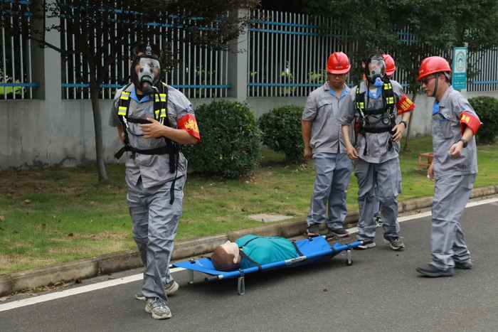 當(dāng)天下午2點(diǎn),演練正式開始。演練場(chǎng)景模擬華騏污水廠磁混凝沉淀池污泥泵房?jī)?nèi)員工在處理污泥泵出口壓力不正常過(guò)程中,未遵守作業(yè)規(guī)程,違規(guī)摘掉正壓送風(fēng)長(zhǎng)管呼吸器,吸入有毒氣體后中毒暈倒?,F(xiàn)場(chǎng)人員發(fā)現(xiàn)后立即上報(bào)公司領(lǐng)導(dǎo),經(jīng)理趕赴事故發(fā)生區(qū)域,成立現(xiàn)場(chǎng)指揮部,啟動(dòng)《有限空間作業(yè)事故專項(xiàng)應(yīng)急預(yù)案》,應(yīng)急救援人員穿戴正壓式空氣呼吸器,攜帶擔(dān)架深入污泥泵房將受傷人員救出;醫(yī)療救護(hù)人員對(duì)中毒人員進(jìn)行心肺復(fù)蘇,救援的同時(shí)撥打 120 急救電話進(jìn)行醫(yī)療救護(hù)求助。最終在各單位的全力配合下,圓滿完成此次應(yīng)急救援任務(wù)。