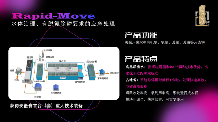 如遇同時要求脫氮除磷的提質(zhì)增效或應(yīng)急處理項目,可選用由魔方磁和魔方尊組合成的“Rapid-Move”系統(tǒng),該系統(tǒng)曾獲得安徽省首臺(套)重大技術(shù)裝備,其發(fā)揮了磁混凝和BAF兩種技術(shù)優(yōu)勢——系統(tǒng)總停留時間僅1小時,占地面積?。怀鏊|(zhì)為準(zhǔn)四類標(biāo)準(zhǔn);模塊化組合,快速部署,可重復(fù)利用。