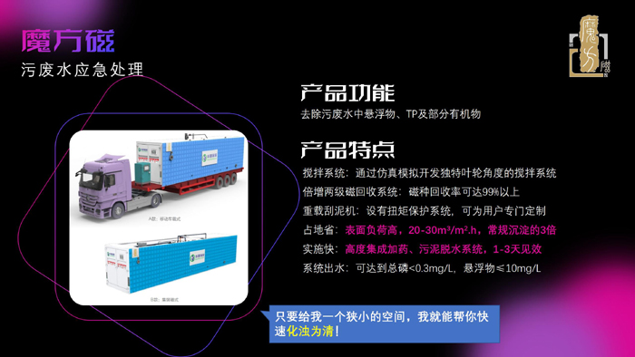 狹小空間亦可快速化濁為清——針對水體治理,以及污水處理廠、工業(yè)廢水廠應(yīng)急處理場景,要求快速解決污水感官問題,以及去除TP的情況下,可以選用魔方智水的魔方磁,其功能是去除SS和TP,它有車載式和集裝箱式兩種形式,采用磁加載混凝澄清技術(shù),表面面負(fù)荷 20 以上、停留時間是常規(guī)沉淀技術(shù)的 1/3-1/4,占地小,處理效率高。高度集成了加藥、污泥脫水以及控制系統(tǒng),快速部署,快則1天,慢則3天就即可見效,處理效果立竿見影。