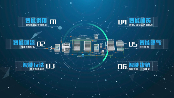 BAF智慧濾池智能調(diào)用、智能回流、智能反洗、智能加藥、智能曝氣、智能決策六駕“馬車”齊發(fā)力,充分發(fā)揮AI 人工智能在水廠運(yùn)營中的有力作用。智能調(diào)用系統(tǒng)自動計(jì)算濾池運(yùn)行數(shù)量,根據(jù)用戶需求交替啟用,確保冬季低溫下出水水質(zhì)穩(wěn)定達(dá)標(biāo),同時(shí)降低曝氣能耗;智能回流系統(tǒng)實(shí)時(shí)調(diào)控回流比,解決了硝化液回流過量的問題,確保濾池精準(zhǔn)脫氮,大幅節(jié)省電耗;針對不同功能的濾池,智能反洗系統(tǒng)通過選用循環(huán)洗、降水位反沖洗、強(qiáng)制反洗等模式,提高反洗效率,降低反洗頻次,節(jié)省電耗;智能加藥系統(tǒng)結(jié)合進(jìn)水水質(zhì)水量,AI智能投加反硝化碳源,確??偟_(dá)標(biāo)的前提下大幅度降低藥耗;智能曝氣系統(tǒng)充分考慮氣泡經(jīng)濾料剪切帶來溶解氧升高的影響,實(shí)現(xiàn)按需供氧,降低曝氣能耗;智能決策系統(tǒng)根據(jù)運(yùn)營需求,對不同控制模塊的經(jīng)濟(jì)性、安全性、穩(wěn)定性進(jìn)行綜合比選,制定精準(zhǔn)、有效的控制方案。
